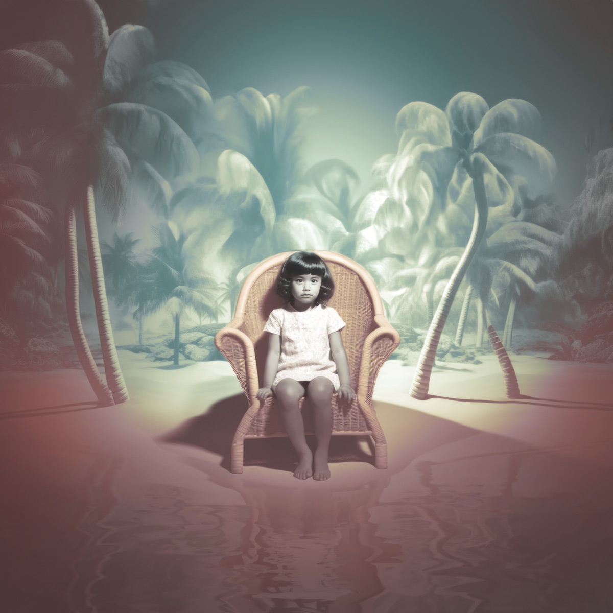 Studio Foto by Sabrina Tirvengadum portrays a small girl resembling the artist’s sister, sat on a beach against a background that appears both realistic in part and like a studio backdrop. The work was inspired by Tirvengadum’s time in Mauritius, on which she reflected: “Mauritius is often described as a paradise island, which is why I found it so interesting that many Mauritians chose to take their portraits indoors, often in front of hand-painted backdrops of idyllic landscapes. Why recreate the outdoors inside when the real beauty was just outside with natural light all around?”